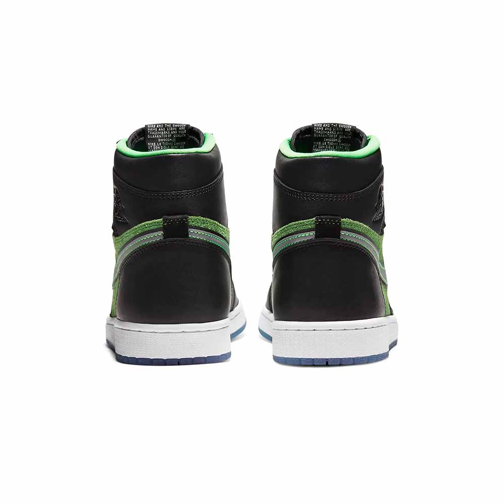 The Air Jordan 1 High Zoom “Zen Green” incorporates Zoom Air technology into the sole of Michael Jordan’s first signature shoe. The Jordan 1 Zoom model made its debut late in 2019 to much success. Now, Jordan Brand returns with this “Zen Green” design as part of its Summer 2020 release cycle, and the results are clearly as favorable. Hairy Zen Green suede dots the perforated toe and mid-panel. Supple black leather overlays can be found on the forefoot, eyelets, collar, and heel. A Silver Metallic Swoosh is located on the mid-panel and features contrasting green stitching. Tonal “Wings” detailing appears on the collar and a mini nylon Zoom tag can be found on the mid-panel beneath the collar. A vibrant neon green sock liner contrasts the black nylon tongue. As previously mentioned, Zoom Air cushioning is embedded within the sole to provide the wearer ample amounts of support.