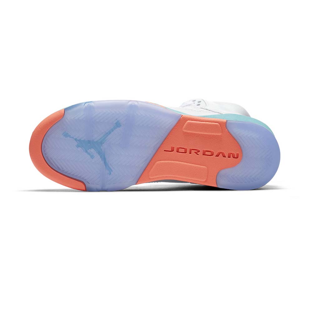 Released in July 2018, the Air Jordan 5 received this fresh new look appropriate for the summer season. The children’s Air Jordan 5 GS Light Aqua features a clean white upper with aqua accents on the midsole and inner lining, while bright orange detailing and icy clear blue portions of the outsole complete the refreshing color palette. The result is a decidedly tropical look. Produced only in childrens sizing, the appealing look of the Air Jordan 5 GS Light Aqua left many collectors wishing that they could get their own pair.