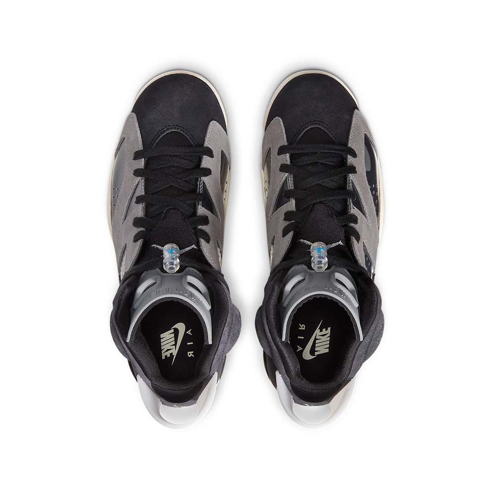Dressed in a Black, Light Smoke Grey, Sail, and Chrome color scheme. This Air Jordan 6 employs a mixture of colors and materials, including transparent TPU on the midsole and pull tab, Grey rubber on the tongue, Black suede on the toe and vamp and a Metallic Jumpman hangtag. Inspirational messages printed on the sockliner include “Be Kind”,”Embrace Uniqueness” and “Spread Love”.