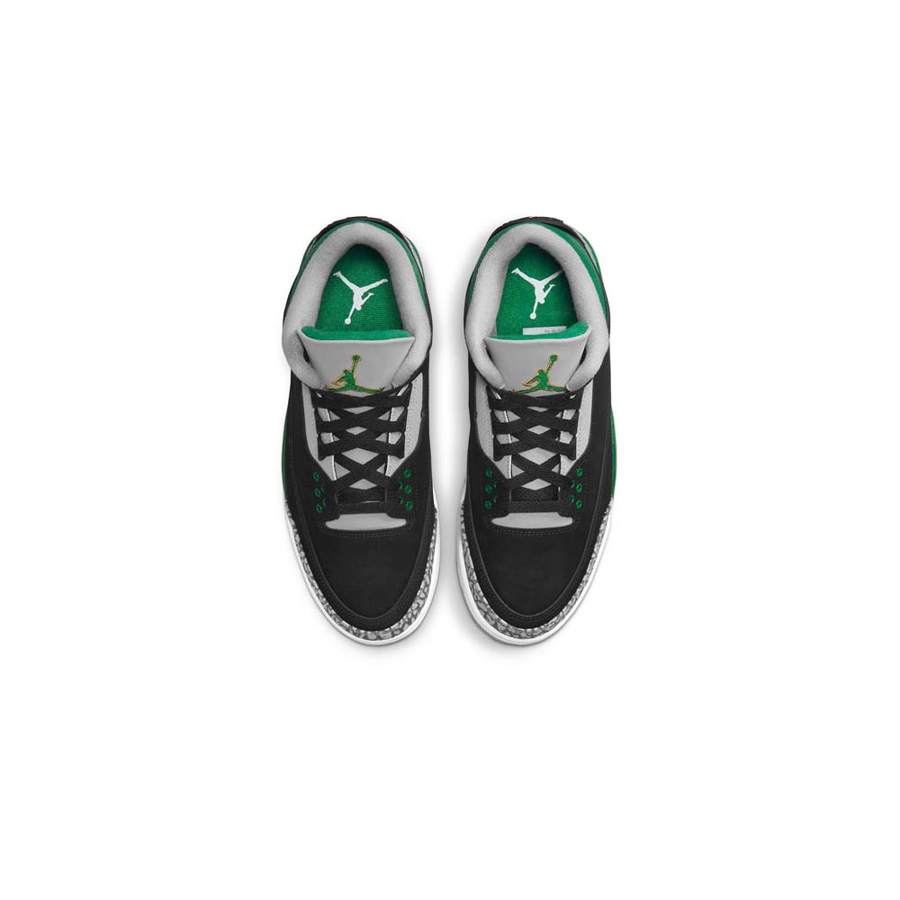 The Air Jordan 3 Pine Green features a black Durabuck upper with signature elephant print overlays and green perforated collars. Hits of Pine Green on the midsole and Jumpman tongue embroidery stand out against their neutral backdrops. From there, a Jumpman heel tab and Air sole adds the finishing touches to this retro design.