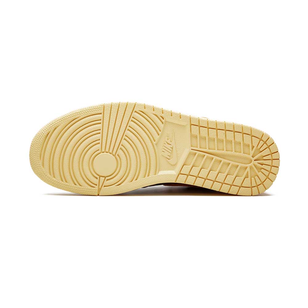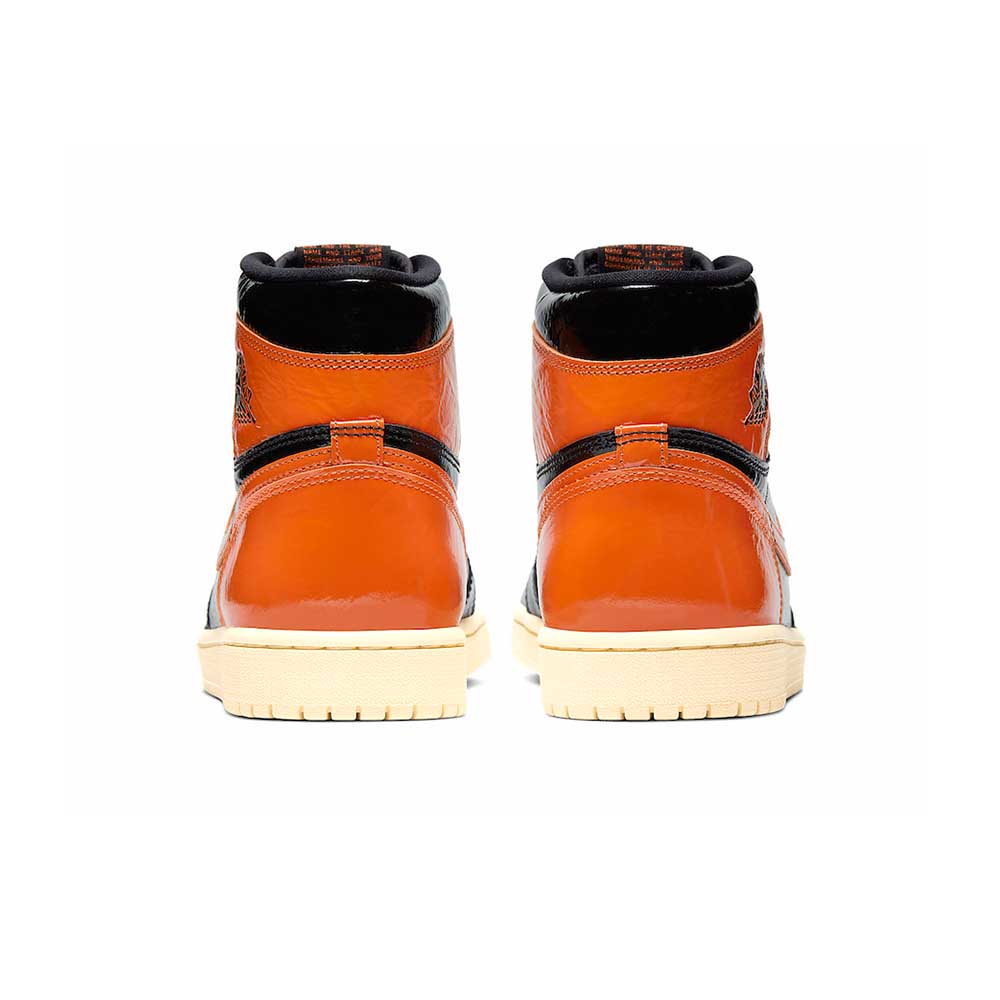 The Air Jordan 1 OG “Shattered Backboard 3.0” is the third release of the immensely sought-after “Shattered Backboard” colorway of the Air Jordan 1. The “Shattered Backboard” theme draws inspiration from an exhibition game in Italy in which Michael Jordan played during his rookie season. During the game, Jordan famously broke the glass of the backboard following a monstrous dunk. The first two iterations of the “Shattered Backboard” were a success due to their use of premium materials and eye-catching orange and black colorways. The “Shattered Backboard 3.0” falls in line with previous versions of the sneaker and adds new design features to stand out on its own. One noticeable difference is that a crinkled glossy patent leather upper replaces the leather found on the first two “Shattered Backboard” models. The black crinkled glossy leather is featured on the mid-panel, toe, and ankle collar. Pale Vanilla Starfish crinkled glossy leather adds bursts of color around the toe, quarter panel, Swoosh, and lateral heel. A black leather Wings logo sits near the collar. A vintage-inspired yellow sole gives the sneaker a lovingly worn in appearance.