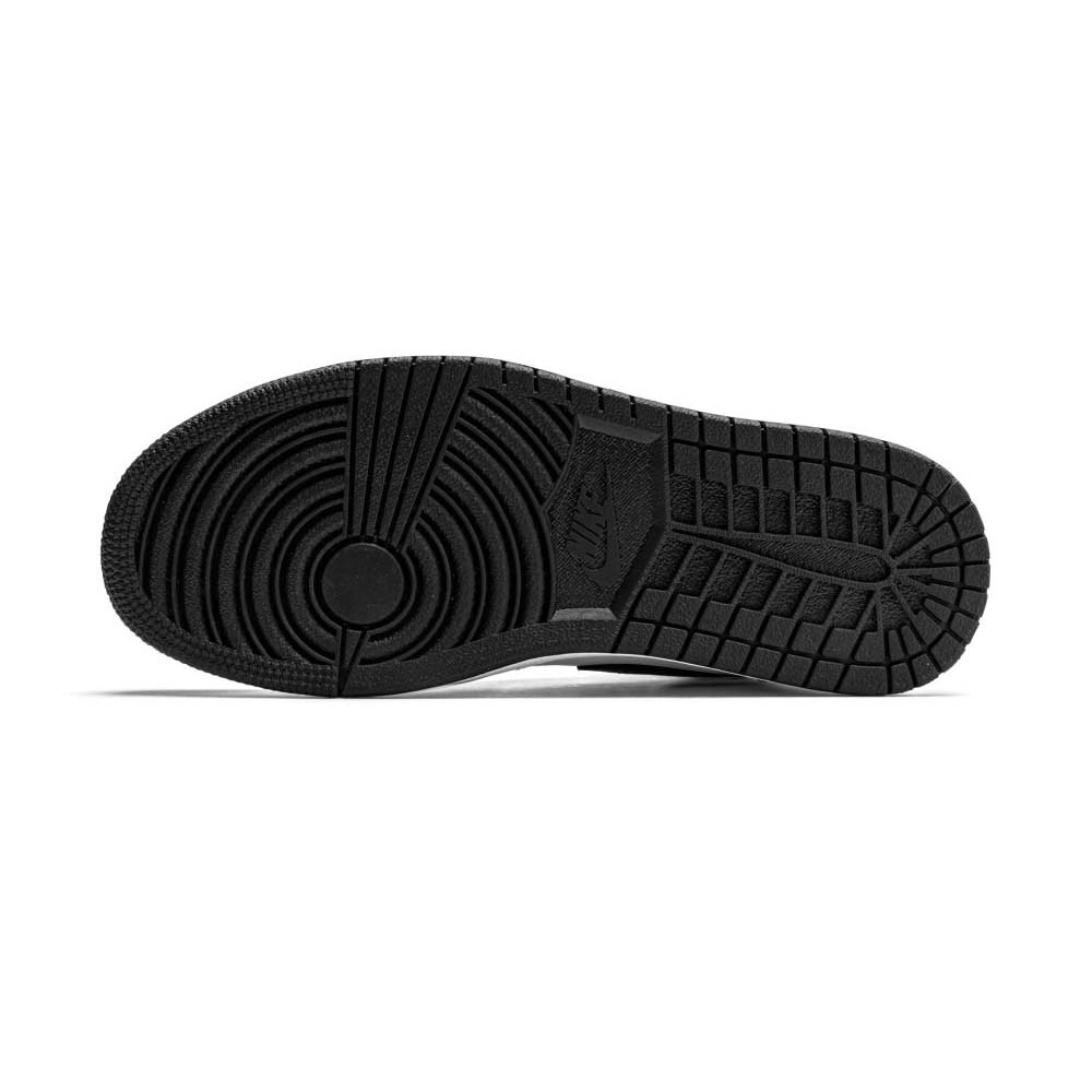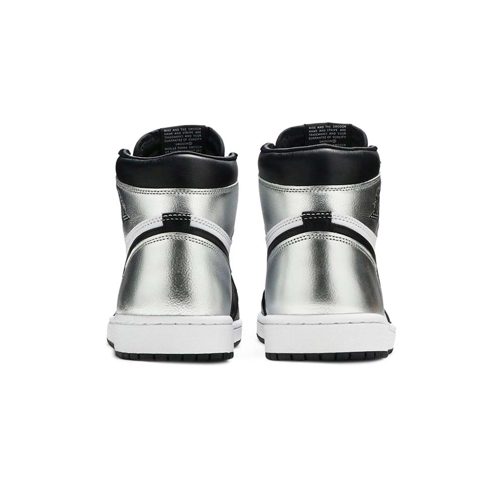 The women’s Air Jordan 1 Retro High OG ‘Silver Toe’ adopts color blocking that recalls the Air Jordan 1 ‘Gold Toe’ from 2018. This pair discards the patent leather build of the older shoe in favor of a standard leather upper, featuring a clean white base with contrasting black forefoot overlays. A shiny metallic silver finish distinguishes the toe box, heel panel and collar flap, the latter stamped with a Jordan Wings logo on the lateral side. Additional branding elements include a black leather Swoosh and a woven Nike tag atop the nylon tongue.